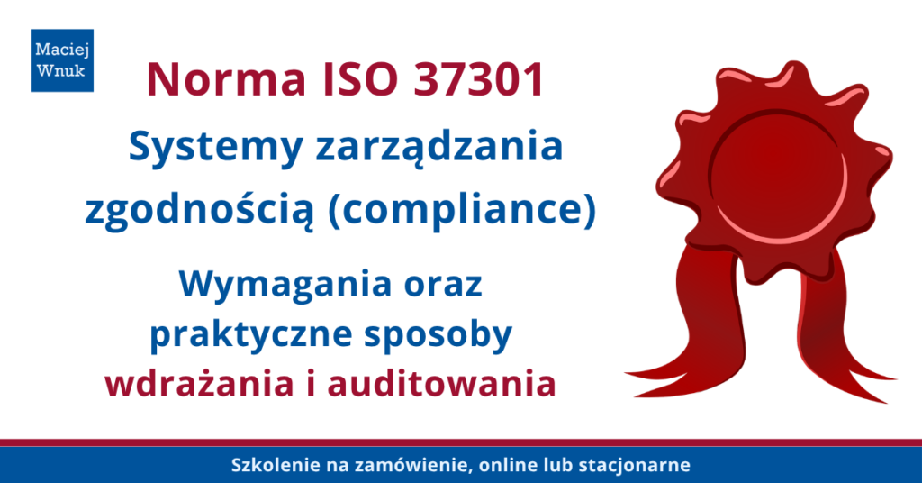 Poznaj ISO 37301 – standard systemów compliance gdzie omawiam wymagania i dobre praktyki wdrażania, ale bez auditowania.